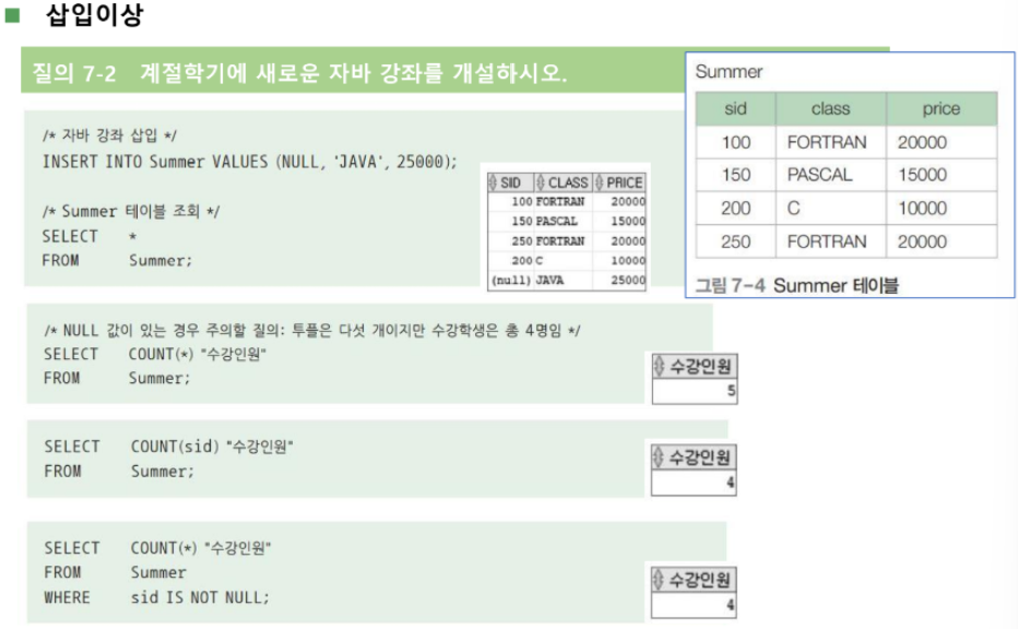 - 삽입이상: 투플 삽입 시 제공되지 못하는 속성값을 NULL 값으로 입력해야 하는 현상이다.