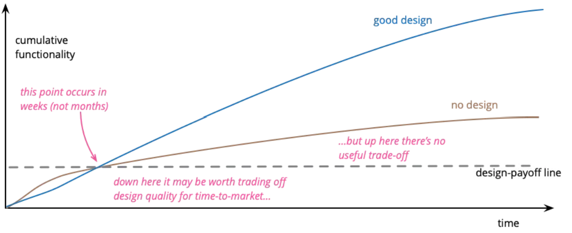- Bad design 곡선: 빨리 내기 위해 설계를 생략하면, 초반엔 빨라 보이지만 곧 결합도와 부채가 누적되어 변경 한 번에 연쇄 수정이 터진다. 일정이 지속적으로 밀리고, 인력이 늘어도 속도가 오르지 않는 역설에 빠진다.