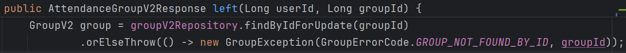 즉, 락의 범위(lock granularity)가 정확히 groupId 단위여야 합니다. 여기서 중요한 선택 포인트가 하나 나옵니다. “참석자 수는 GroupUserV2 테이블에 있는데, 왜 GroupV2(모임) 엔티티를 잠그는가?!” 정원 체크는 실제로는 다음 쿼리로 수행됩니다.