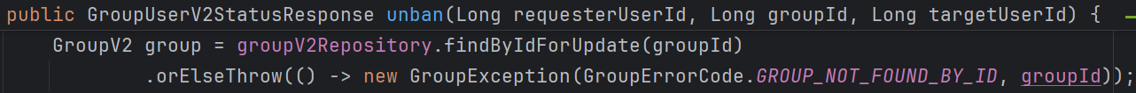 SELECT ... FOR UPDATE 로 GroupV2 row를 가져온다는 것은, DB에게 “이 모임에 대한 상태 변경은 내가 끝날 때까지 아무도 못 하게 막아줘.” 요청하는 것입니다. 여기서 말하는 “상태 변경”은 단순히 GroupV2.status만이 아닙니다.