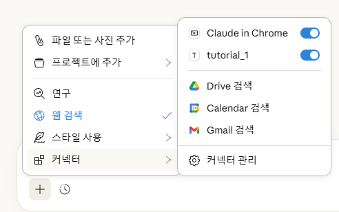 Claude가 다시 실행되었다면, 검색창의 검색 및 도구에서 커넥터를 확인하면 현재 연동된 MCP 서버 목록을 확인할 수 있습니다.