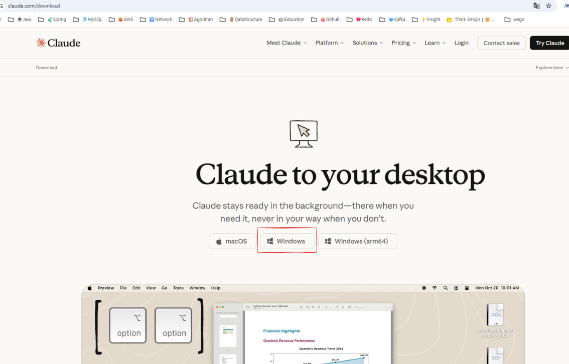 Claude Desktop 설치를 위해 공식 다운로드 홈페이지에서 운영체제와 동일한 설치 파일을 선택합니다.