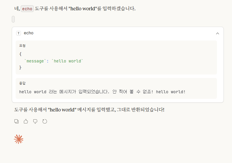 입력받은 메시지를 그대로 반환하는 도구가 있지? 그것을 사용해서 hello world를 입력해 줘.