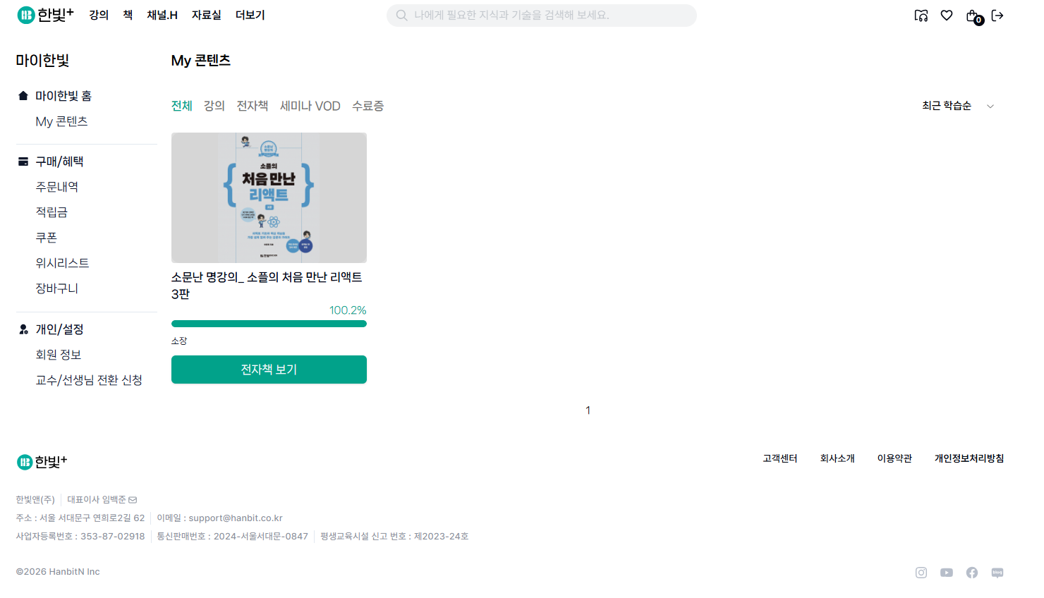 한빛미디어의 새롭게 출간한 여러 도서 중에서 원하는 두 권을 선택하고, 두 권 중에서 랜덤으로 전자책이 개인 계정으로 지급되는 방식이에요. 그래서 내가 정말로 원하는 책으로 리뷰를 못하는 상황에 놓이지 않을까봐 걱정했는데, 감사하게도 리액트 책으로 지급받게 되었습니다. 덕분에 소플님께서 집필하신 리액트 입문 책으로 리액트 입문을 시작할 수 있게 되어 담당자 분에게 정말 감사드리며 리뷰를 시작합니다.😍