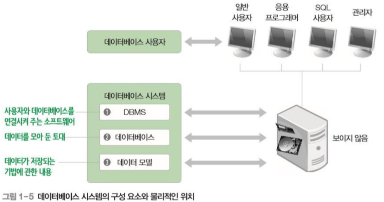 데이터베이스 시스템(Database System)은 각 조직에서 사용하던 데이터를 통합하고 공유할 때 생기는 장점을 이용하는 시스템이다. 데이터베이스 시스템은 [그림 1-5]와 같이 데이터베이스 관리 시스템(DataBase Management System, DBMS), 데이터베이스(database), 데이터 모델(data model)의 세 가지로 구성된다.