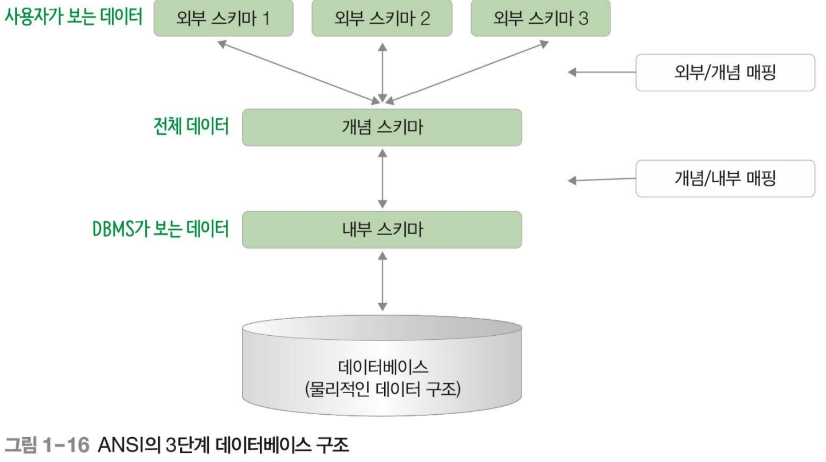 3단계 데이터베이스 구조는 [그림 1-16]와 같이 외부 단계, 개념 단계, 내부 단계로 나뉜다. 각 단계를 설명하는 데 사용되는 용어인 '스키마(schema)'는 그리스어에서 유래된 단어로 조직이나 구조를 의미한다.