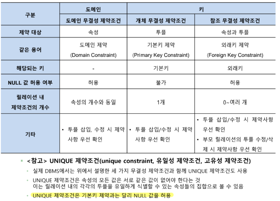 무결성 제약조건에는 투플에 삽입할 수 있는 데이터의 값을 제한하는 도메인 무결성 제약조건과 관계 데이터 모델의 핵심인 관계 표현을 위한 개체 무결성 제약조건, 참조 무결성 제약조건이 있다.