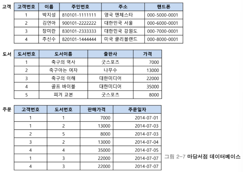 외래키(참조하는 키)는 참조되는 릴레이션의 기본키와 달리 NULL 값을 포함할 수 있고 중복값도 허용한다. [그림 2-9]의 주문 릴레이션을 보면 고객번호 1이 세 번 중복된 것을 확인 할 수 있다.