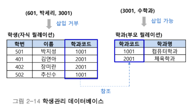 참조 무결성 제약조건은 개체 무결성 제약조건과 달리 단일 릴레이션에 관한 내용이 아니다. [그림 2-14] 학생관리 데이터베이스의 예로, 부모 릴레이션(기본키가 참조되는 릴레이션)과 자식 릴레이션(기본키를 참조하는 릴레이션)의 관계를 보여준다. 학과 릴레이션이 부모 릴레이션이고, 학생 릴레이션이 자식 릴레이션이다.