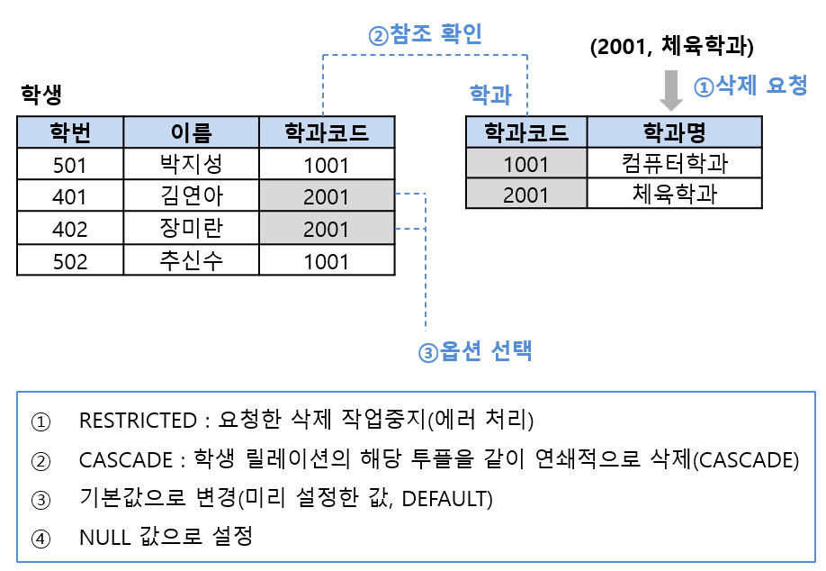 - 자식 릴레이션의 관련 투플을 삭제